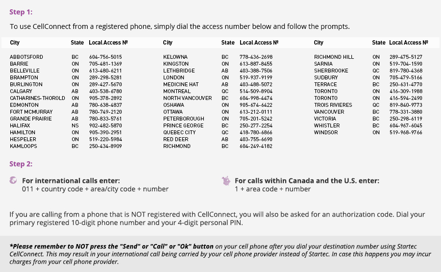 Startec Talk Plus Direct Dial and CellConnect rates in effect since January 2014. International calls to some cellular numbers may be charged at different rates. 75¢ per call surcharge applies on CellConnect calls made from pay phones. GST, PST or HST charges apply. Monthly Recurring Charges of $2.99 or a Minimum Usage Requirement of $5.00 or $10.00 apply depending on plan selection. Paper bill fee of $2 applies to plans with paper billing. By subscribing to or using Startec’s service, you agree to the charges and terms and conditions in Startec’s Customer Service Agreement that can be found at www.startec.com.